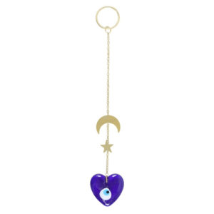 Add a touch of celestial charm to any space with this glass hanging decoration featuring a gold-tone chain adorned with a crescent moon, star, and two heart-shaped all seeing eye glass accents. Perfect for windows, walls or sacred spaces, it brings a sense of protection and mystical beauty to the home.