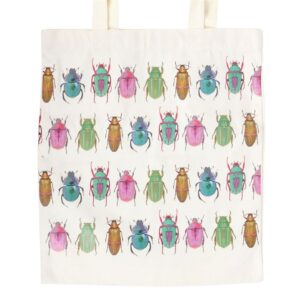 This handy polycotton canvas tote bag is durable for carrying everything from groceries to books or even essentials for any trip. Featuring a captivating, colourful beetle print, this tote bag adds a touch of whimsy charm to any outfit. 95% polyester 5% cotton. Hand wash only.