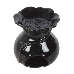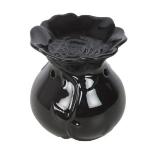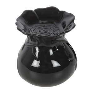 Exquisitely sculpted into the form of a dark rose in bloom, this ceramic oil burner is a captivating piece for scenting the home with your chosen fragrance oils. Simply place a tealight beneath and a few drops of diluted oil in the dish to summon your chosen atmosphere. Recommended for use with fragrance oil diluted with water. Never leave a lit candle unattended.