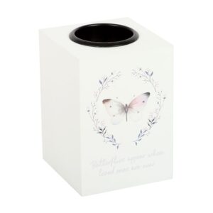 This white box-style MDF tealight holder features a delicate grey butterfly illustration and the touching phrase ‘Butterflies appear when loved ones are near’, bringing warmth and comfort to any setting. With a space on top for a single standard tealight, it’s ideal for creating a peaceful atmosphere in remembrance displays or as a heartfelt gift. Never leave a lit candle unattended.