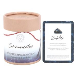 Crafted from rich, warm rosewood beads and interlaced with vibrant Sodalite stones, this elegant necklace features 108 beads — a traditional number in Mallah necklaces, symbolizing spiritual journey and mindfulness — and is finished with a decorative tassel. The Sodalite, renowned for its connection to communication and truth, is associated with the throat chakra. It is believed to enhance clear thinking, verbal expression, and emotional balance, encouraging the wearer to speak their truth with clarity and confidence. A Mallah, or Mala, necklace is a string of beads traditionally used in meditation and prayer in various spiritual practices including Buddhism and Hinduism. Each bead represents a repetition of a mantra or prayer, aiding in focus and spiritual contemplation. To use simply hold the necklace in one hand and move from bead to bead whilst focusing on mindful breathing and repeating an intention. The necklace can be worn throughout the day as a reminder of these intentions. Each Mallah Necklace is presented in a beautifully designed box, accompanied by a corresponding information card, making it an ideal and thoughtful gift for a loved one who values clear communication, truth, and emotional harmony.