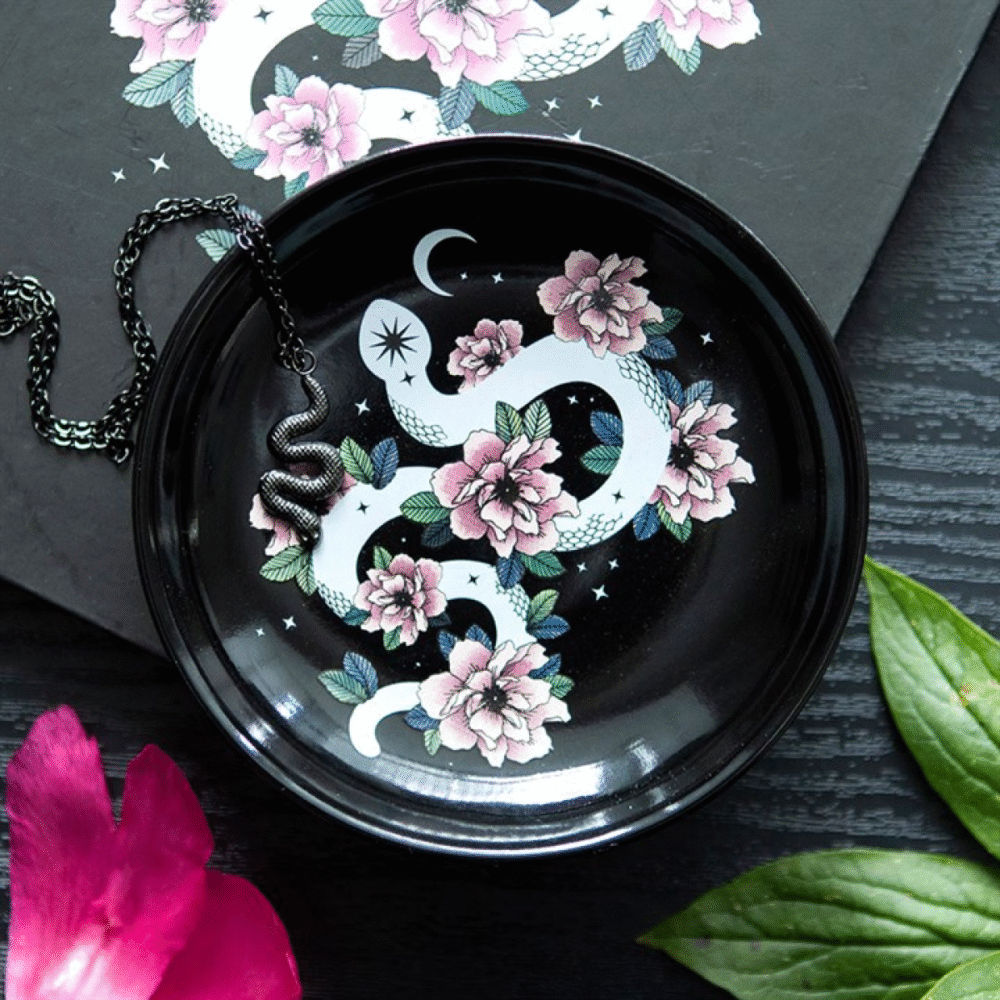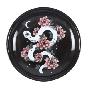 This trinket dish features a curled, white snake and soft pink flower design set against a black, starry sky. Perfect for holding jewellery, keys, and other small treasures, this design celebrates the harmony between nature’s light and dark elements, making it a beautiful accent for homes that appreciate both strength and softness.