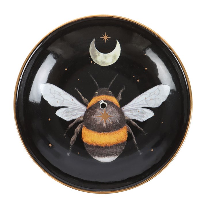Practical and stylish, this gorgeous incense plate is adorned with a delicate forest bee design with pretty celestial details including a silvery moon and golden stars. The plate is thoughtfully designed to accommodate both incense sticks and cones, featuring a small hole in the center for sticks and a flat, stable surface suitable for burning cones.
