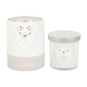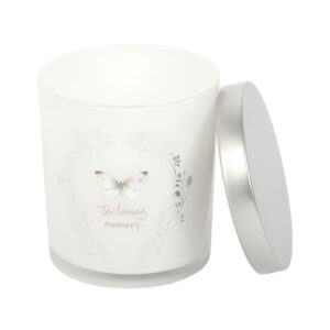 Softly scented with vanilla, this candle features a white butterfly design and the words ‘In loving memory’, offering a peaceful way to honour and remember those who are no longer with us. A thoughtful choice for personal remembrance or as a sympathy gift. Approximately 35-hour burn time. Made from paraffin wax. Never leave a lit candle unattended.