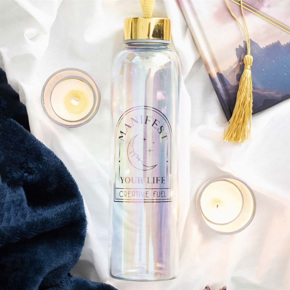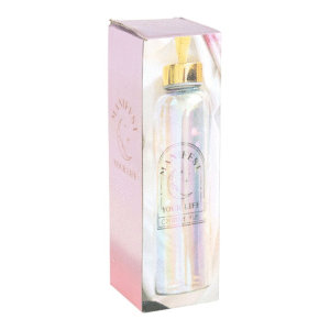 Stay hydrated in style with this eye-catching iridescent glass water bottle, featuring the inspiring words “Manifest Your Life” in elegant gold lettering. Finished with a gold metal screw top lid and loop for easy carrying. 500ml capacoty. Do not microwave. Handwash only.