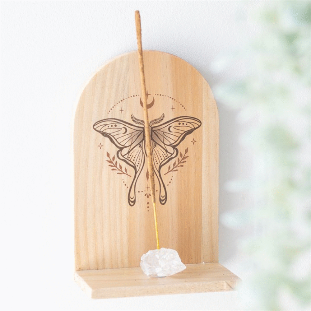 Add a touch of ethereal ambiance to the home with this natural wooden incense shelf featuring an elegant luna moth design, perfect for dispersing fragrance more freely. When not in use, the shelf can be used to display treasured crystals or trinkets. A pre-installed bracket on the reverse makes hanging this shelf quick and easy.