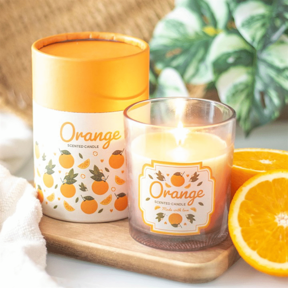 Add some zest to your space with this orange scented candle. Encased in a glass holder accented by a fruity orange print design, this candle has a wooden lid and packaged in a matching cylinder box, perfect for gifting. Approximate burn time of 25 hours. Please practice caution when burning and never leave lit candle unattended.