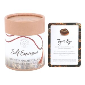 Crafted from rich, warm rosewood beads and interlaced with striking Tiger’s Eye stones, this elegant necklace displays 108 beads — a traditional count in Mallah necklaces symbolizing a spiritual journey and mindfulness — and is completed with a decorative tassel. The Tiger’s Eye, known for its empowering and protective qualities, is associated with the throat chakra, fostering self-expression and communication. It is believed to enhance confidence, encourage clear thinking, and empower the wearer to speak their truth with clarity and courage. A Mallah, or Mala, necklace is a string of beads traditionally used in meditation and prayer in various spiritual practices including Buddhism and Hinduism. Each bead represents a repetition of a mantra or prayer, aiding in focus and spiritual contemplation. To use simply hold the necklace in one hand and move from bead to bead whilst focusing on mindful breathing and repeating an intention. The necklace can be worn throughout the day as a reminder of these intentions. Each Mallah Necklace is presented in a beautifully designed box, accompanied by a corresponding information card, making it an ideal and thoughtful gift for a loved one who values communication, confidence, and personal growth.