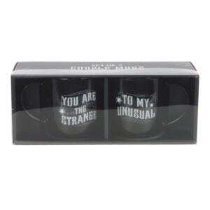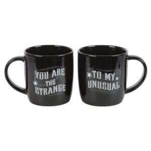 Unique relationships deserve unique drinkware! This pair of gothic mugs features ‘You are the strange’ and ‘to my unusual’ text for showing off the couple’s offbeat love story. 350ml capacity each. Dishwasher and microwave safe.