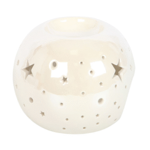This white iridescent oil burner and wax warmer adds a beautiful blend of elegance and whimsy to any space. Its pearly finish shimmers in changing light, while the star-shaped cut outs project soft, starry reflections. Pair with a relaxing fragrance oil or wax melts and enjoy the soothing aroma and gentle glow.